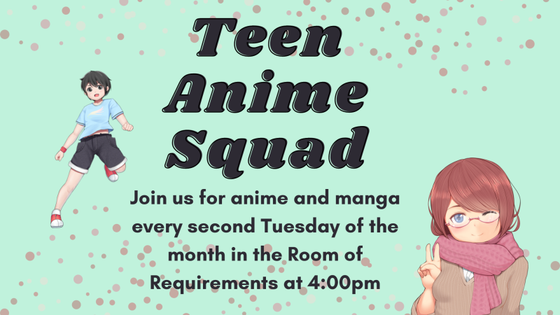 This squad is for teens, ages 12-19, and for fans of all things anime! The club will meet on the second Tuesday every month to watch anime and read manga. In the Room of Requirements at 4:00pm.